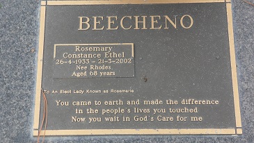 BEECHENO ROSEMARY CONSTANCE ETHEL 26.4.1933 – 21.3.2002 nee RHODES aged 68 years. To an Elect Lady known as Rosemary. You came to earth and made the difference in the peoples lives you touched. Now you wait in God’s Care for me |
