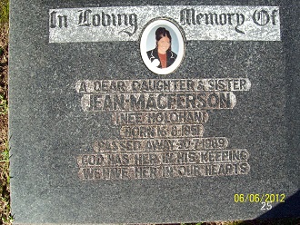 In loving Memory of our dear daughter & sister JEAN MACFERSON (nee HOLOHAN) Born 16.8.1951 Passed away 30.7.1989. God has her in his keeping. We have her in our hearts. Death Cert No. 1989/6497 Parents Charles Holohan and Janet nee Pedlow. |