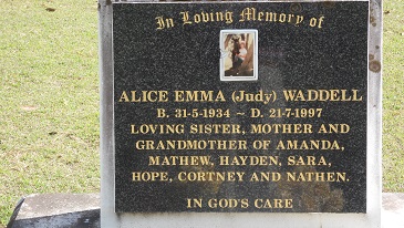 In loving memory of ALICE EMMA (JUDY) WADDELL B.31.5.1934-d.21.7.1997 loving sister mother grandmother of Amanda, Mathew, Hayden, Sara, Hope, Courtney and Nathen; In God’s Care. |